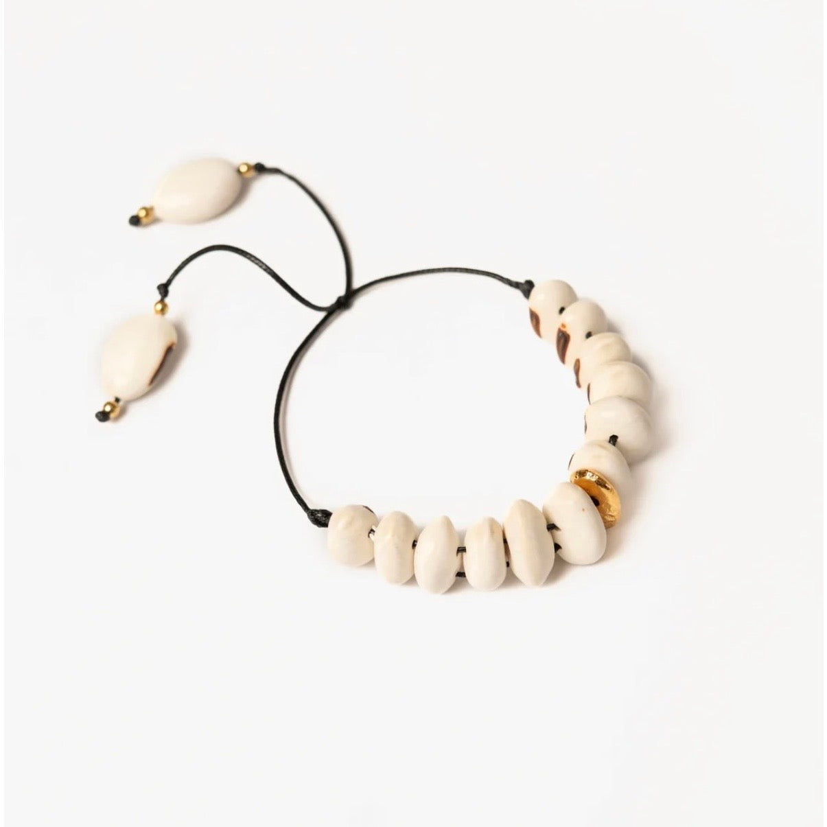 This artisan bracelet honors the craftsmanship of rural Colombian women, featuring authentic Santander white beans paired with waxed cotton and 24K gold-plated copper beads. Handmade by the Family Collective in Bucuramanga, it embodies both natural abundance and environmental stewardship, with seeds sourced from biodiversity-preserving gardens. A wearable testament to ethical artisanal creation.