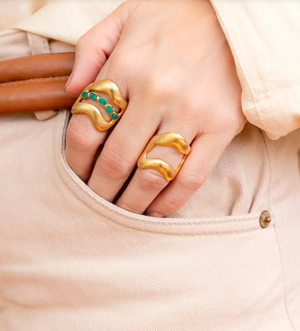 A powerful ring resembling the most important emerald mine in Colombia, Muzo. Muzo becomes a symbol of both the organic and the opulent, of beauty that blooms deep within the earth. A collection that honors the landscape of Muzo. A bold look for your wardrobe. Made with raw emeralds and 24k. gold plated over brass. Handmade in Colombia.