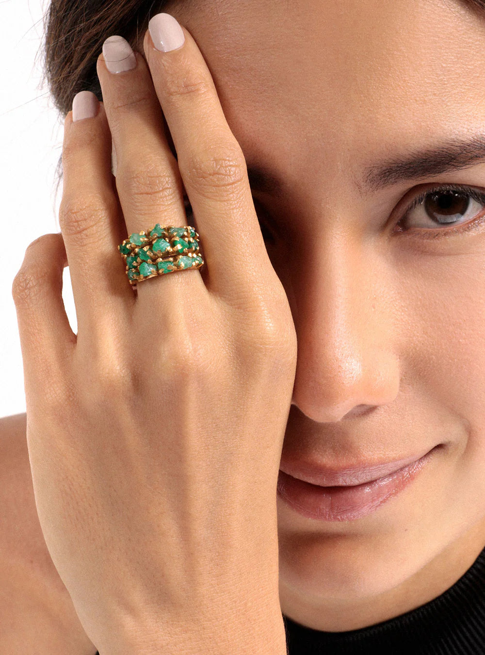 Sculptural and strong, this three-layered ring is designed with a structural silhouette that brings the raw emeralds into perfect alignment. A bold statement piece made to be shown off—ideal for your most special occasions. Featuring raw Colombian emeralds.